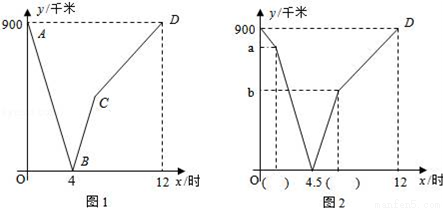 一列快车从甲地匀速驶往乙地,一列慢车从乙地匀速驶往甲地,两车同时出发.不久,第二列快车也从甲地发往乙地,速度与第一列快车相同.在第一列快车与慢车相遇30分后,第二列快车与慢车相遇.设慢车行驶的时间为x(单位:时),慢车与第一、第二列快车之间的距离y(单位:千米)与x(单位:时)之间的函数关系如图1、图2,根据图象信息解答下列问题: