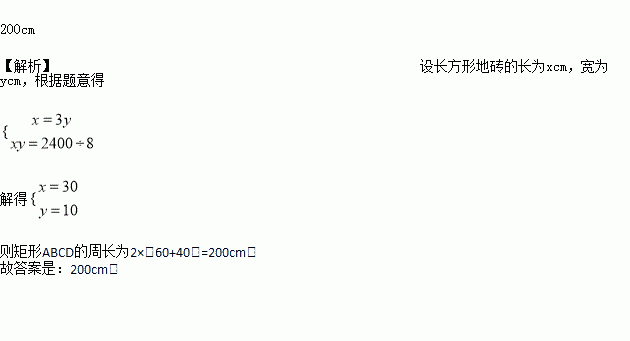 我市新建成的龙湖公园,休息长廊附近的地面都是用一种长方形的地砖铺设的,如图,测得8块相同的长方形地砖恰好可以拼成面积为2400cm2的长方形ABCD,则矩形ABCD的周长为__.