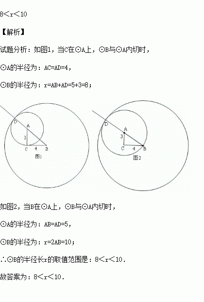 如图,已知Rt△ABC,∠C=90°,AC=3,BC=4.分别以点A、B为圆心画圆.如果点C在⊙A内,点B在⊙A外,且⊙B与⊙A内切,那么⊙B的半径长r的取值范围是 .