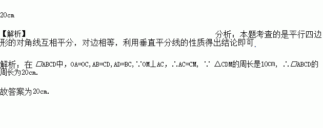 如图,□ABCD的对角线相交于点O,且AD≠CD,过点O作OM⊥AC,交AD于点M,如果△CDM的周长是10㎝,则□ABCD的周长为______________
