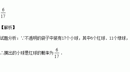 一个不透明的袋子中装有17个小球,其中6个红球、11个绿球,这些小球除颜色外无其它差别,从袋子中随机摸出一个小球,则摸出的小球是红球的概率为 .