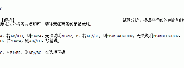 C. 若∠1=∠2,则AD//BC D. 若∠3=∠4,则AD//BC