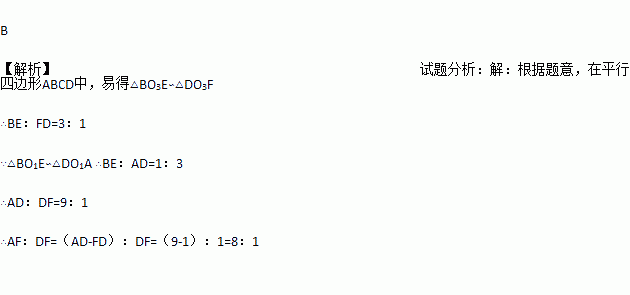 如图,在平行四边形ABCD中,O1、O2、O3分别是对角线BD上的三点,且BO1=O1O2=O2O3=O3D,连接AO1并延长交BC于点E,连接EO3并延长交AD于点F,则AF:DF等于( )