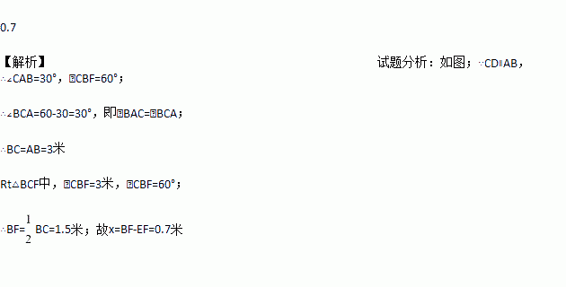如图:一辆汽车在一个十字路口遇到红灯刹车停下,汽车里的驾驶员看地面的斑马线前后两端的视角分别是∠DCA=30°和∠DCB=60°,如果斑马线的宽度是AB=3米,驾驶员与车头的距离是0.8米,这时汽车车头与斑马线的距离x是多少?