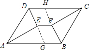分析 (1)延长DE交AB于G,延长BF交CD于H,由DE是∠CDA的平分线,BF是∠ABC的平分线,得到∠ABF=$\frac{1}{2}∠$ABC,∠CDG=$\frac{1}{2}∠$ADC,根据四边形ABCD 是平行四边形,得到∠ADC=∠ABC,推出DG∥BH,根据已知条件得到AE⊥DG,得到E是DG的中点,同理F是BH的中点,即可得到结论;