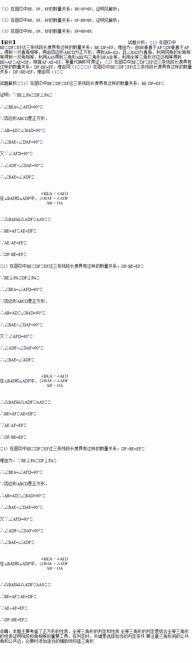 (1)如图①,请探究BE、DF、EF这三条线段的长度具有怎样的数量关系?