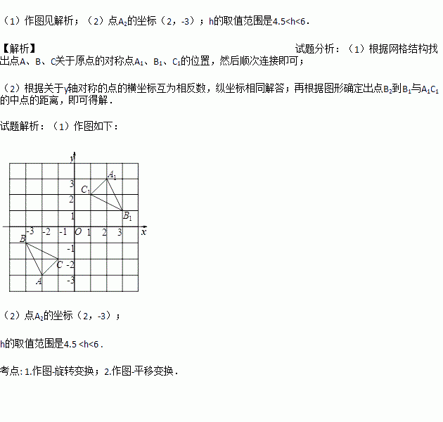 (2)请写出点B关于y轴对称的点B2的坐标,若将点B2向上平移h个单位,使其落在△A1B1C1内部,指出h的取值范围.