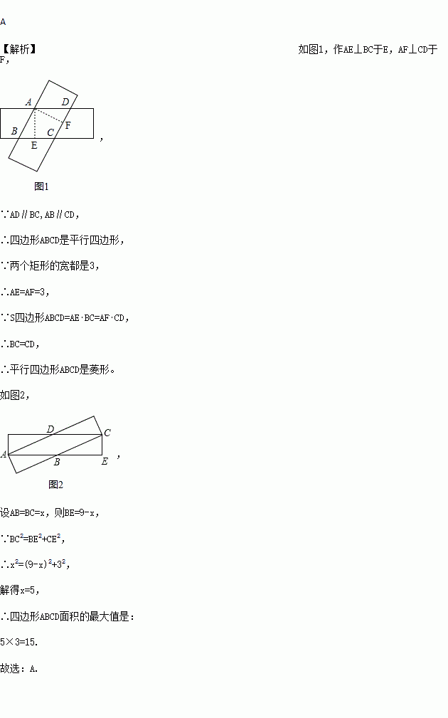 如图,由两个长为9,宽为3的全等矩形叠合而得到四边形ABCD,则四边形ABCD面积的最大值是( )