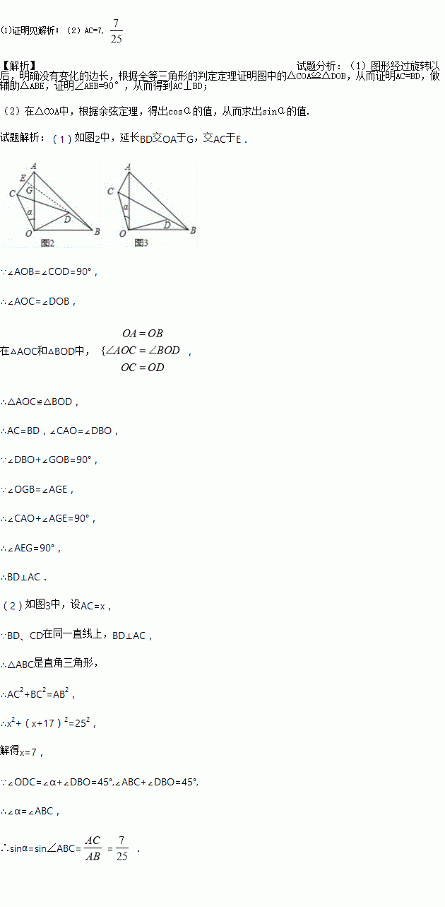 两块等腰直角三角形纸片AOB和COD按图1所示放置,直角顶点重合在点O处,AB=25,CD=17.保持纸片AOB不动,将纸片COD绕点O逆时针旋转α(0°<α<90°)角度,如图2所示.