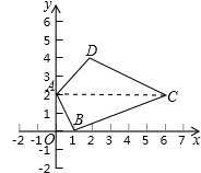 ∵A、B、C、D的四个点的坐标分别为(0,2)、(1 ,0 )、(6,2)、(2,4),