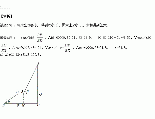 如图,A为某旅游景区的最佳观景点,游客可从B处乘坐缆车先到达小观景平台DE观景,然后再由E处继续乘坐缆车到达A处,返程时从A处乘坐升降电梯直接到达C处,已知:AC⊥BC于C,DE∥BC,BC=110米,DE=9米,BD=60米,α=32°,β=68°,求AC的高度.(参考数据:sin32°≈0.53;cos32°≈0.85;tan32°≈0.62;sin68°≈0.93;cos68°≈0.37;tan68°≈2.48)