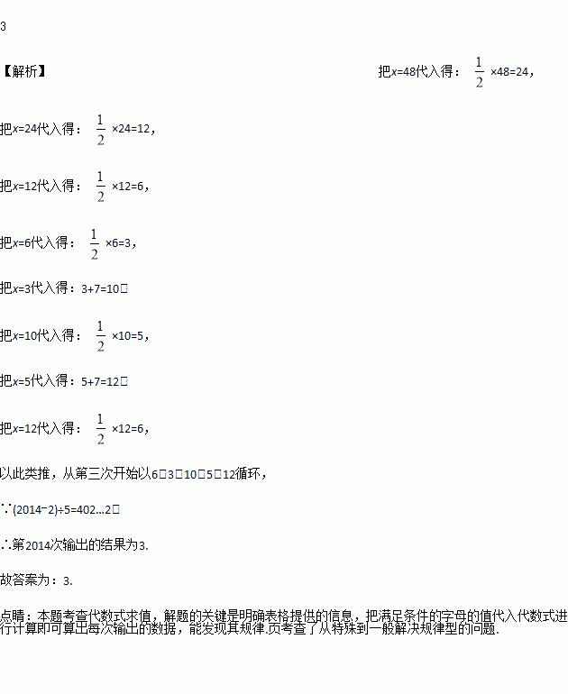 按如图所示的程序计算,若开始输入的x的值为48,我们发现第一次得到的结果为24,第2次得到的结果为12,…,则第2014次得到的结果为 _________________ .