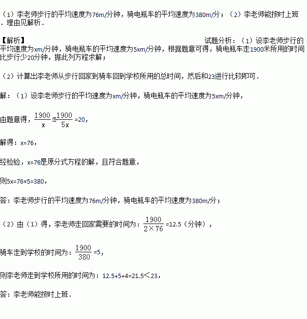 李老师家距学校1900米,某天他步行去上班,走到路程的一半时发现忘带手机,此时离上班时间还有23分钟,于是他立刻步行回家取手机,随后骑电瓶车返回学校.已知李老师骑电瓶车到学校比他步行到学校少用20分钟,且骑电瓶车的平均速度是步行速度的5倍,李老师到家开门、取手机、启动电瓶车等共用4分钟.
