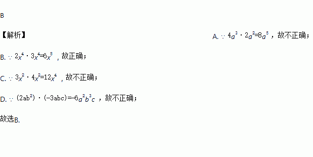 A. 4a3·2a2=8a6 B. 2x4·3x4=6x8 C. 3x2·4x2=12x2 D. (2ab2)·(-3abc)=-6a2b3