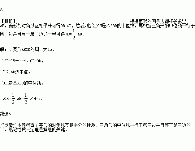 如图所示,菱形ABCD中,对角线相交于点O,E为AD边中点,菱形ABCD 周长为16,则OE的长为( )