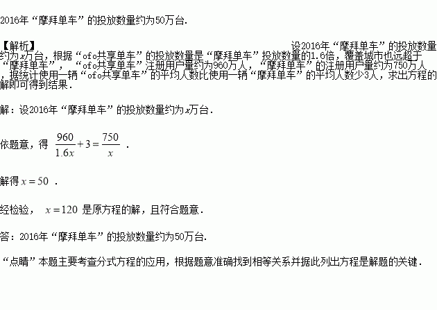 2016年共享单车横空出世,更好地解决了人们“最后一公里”出行难的问题,截止到2016年底, “ofo共享单车”的投放数量是“摩拜单车”投放数量的1.6倍,覆盖城市也远超于“摩拜单车”, “ofo共享单车”注册用户量约为960万人,“摩拜单车”的注册用户量约为750万人,据统计使用一辆“ofo共享单车”的平均人数比使用一辆“摩拜单车”的平均人数少3人,假设注册这两种单车的用户都在使用共享单车,求2016年“摩拜单车”的投放数量约为多少万台?