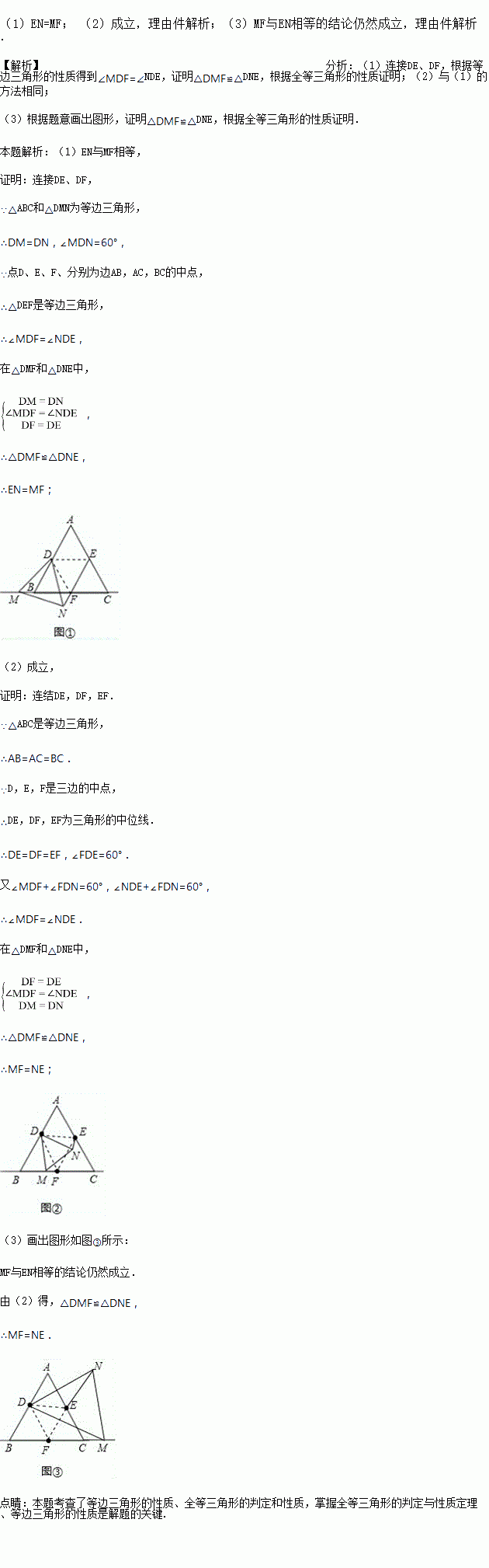 如图,等边三角形ABC中,点D、E、F、分别为边AB,AC,BC的中点,M为直线BC动点,△DMN为等边三角形