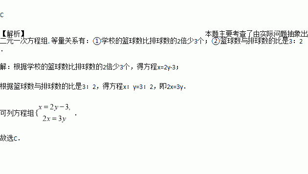学校的篮球数比排球数的2倍少3个,篮球数与排球数的比是3:2,求两种球各有多少个?若设篮球有x个,排球有y个,依题意,得到的方程组是( )