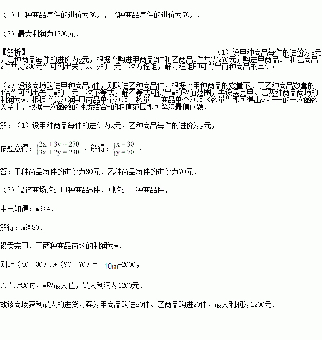 (2)商场决定甲商品以每件40元出售,乙商品以每件90元出售,为满足市场需求,需购进甲、乙两种商品共100件,且甲种商品的数量不少于乙种商品数量的4倍,请你求出获利最大的进货方案,并确定最大利润.