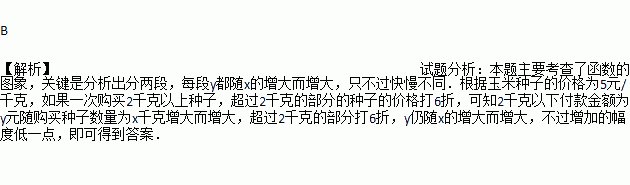 “黄金1号”玉米种子的价格为5元/千克,如果一次购买2千克以上的种子,超过2千克部分的种子价格打6折,设购买种子数量为x千克,付款金额为y元,则y与x的函数关系的图象大致是( )