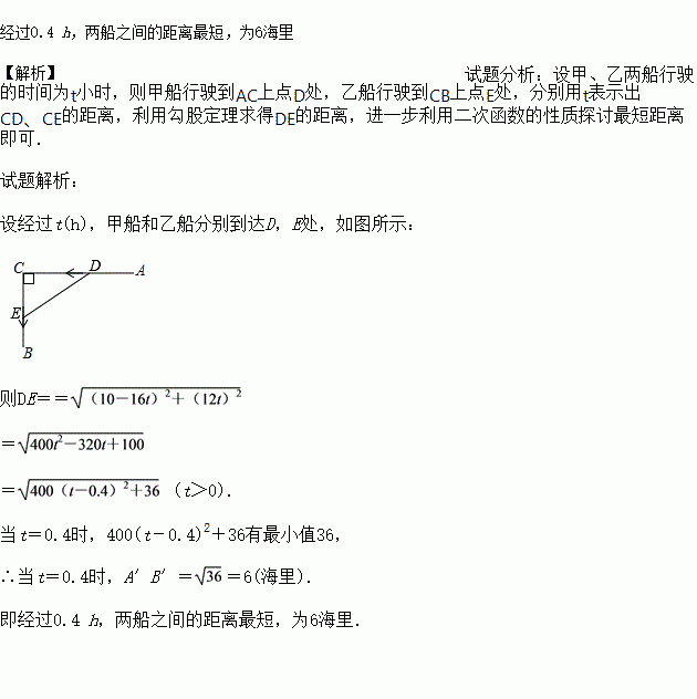 甲船和乙船分别从A港和C港同时出发,各沿图中箭头所指的方向航行(如图所示).现已知甲、乙两船的速度分别是16海里/时和12海里/时,且A,C两港之间的距离为10海里.问:经过多长时间,甲船和乙船之间的距离最短?最短距离为多少?(注:题中的“距离”都是指直线距离,图中AC⊥CB.)