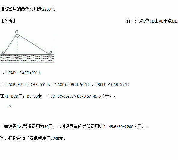 某校生物兴趣小组把一块沿河的三角形废地(如图)开辟为生物园(设AB段河岸为直线),已知∠ACB=90°,∠CAB=55°,BC=80米,学校决定在点C处建一个蓄水池,利用管道从河中取水,已知每铺设1米管道费用为50元,求铺设管道的最低费用(精确到1元).(参考数据:sin55°≈0.82,cos55°≈0.57,tan55°≈1.43)