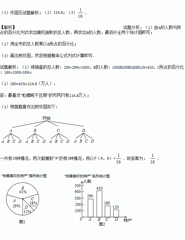 某超市计划经销一些特产,经销前,围绕“A:绥中白梨,B:虹螺岘干豆腐,C:绥中六股河鸭蛋,D:兴城红崖子花生”四种特产,在全市范围内随机抽取了部分市民进行问卷调查:“我最喜欢的特产是什么?”(必选且只选一种).现将调查结果整理后,绘制成如图所示的不完整的扇形统计图和条形统计图.