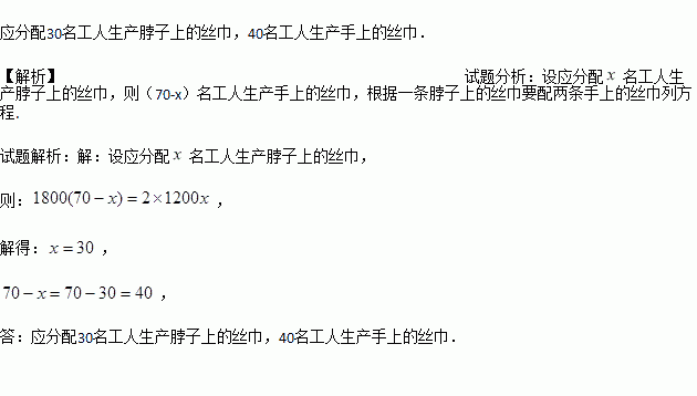 广州亚运会中,志愿者们手上、脖子上的丝巾非常美丽,车间70名工人承接了生产丝巾的任务,已知每人每天平均生产手上的丝巾1800条或脖子上的丝巾1200条,一条脖子上的丝巾要配两条手上的丝巾,为了使每天生产的丝巾正好配套,应分配多少名工人生产脖子上的丝巾,多少名工人生产手上的丝巾?
