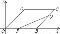 (本题满分12分)如图,平行四边形OBCD中,OB=8cm,BC=6cm,∠DOB=45°,点P从O沿OB边向点B移动,点Q从点B沿BC边向点C移动,P,Q同时出发,速度都是1cm/s.