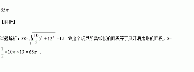 如图,这是某同学用纸板做成的一个底面直径为10cm,高为12cm的无底圆锥形玩具(接缝忽略不计),则做这个玩具所需纸板的面积是_____________cm2(结果保留