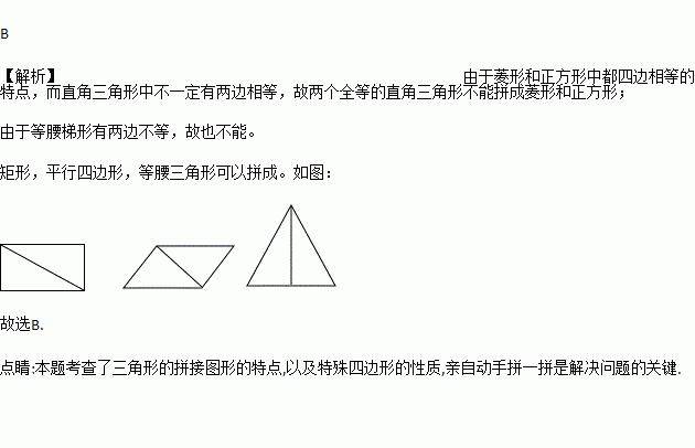 用两个全等的直角三角形拼下列图形:①矩形;②菱形;③正方形;④平行四边形;⑤等腰三角形;⑥等腰梯形.其中一定能拼成的图形是( ).