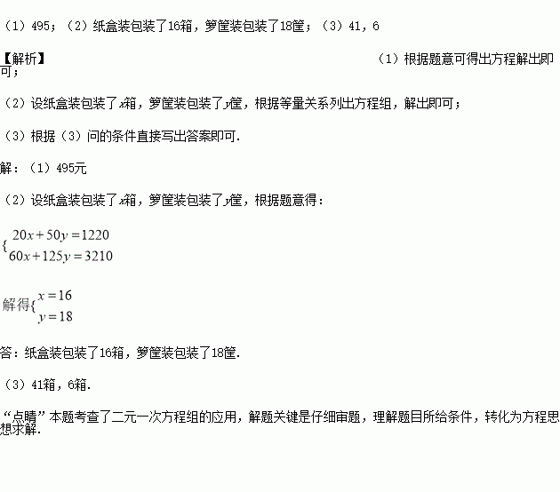 (2)假如预计这批瓯柑全部售完,总销售额为3210元时.请问纸盒装包装了多少箱,箩筐装包装了多少筐?
