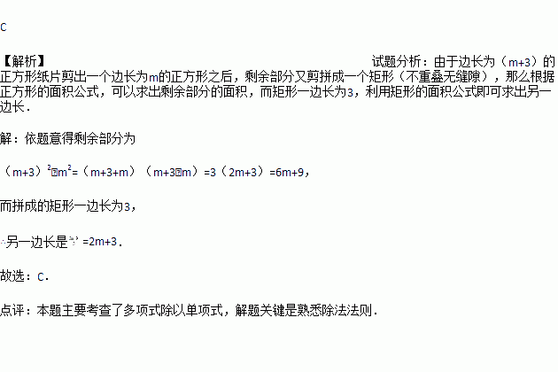 如图,边长为(m+3)的正方形纸片,剪出一个边长为m的正方形之后,剩余部分可剪拼成一个矩形(不重叠无缝隙),若拼成的矩形一边长为3,则另一边长是( )