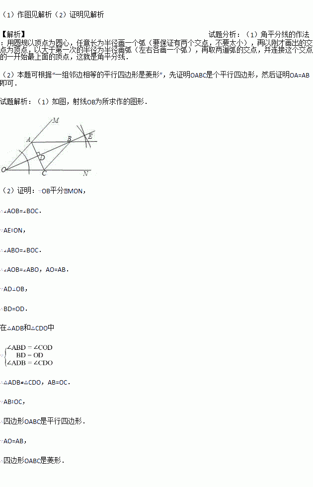 (2)在(1)中,过点A画OB的垂线,垂足为点D,交ON于点C,连接CB,将图形补充完整,并证明四边形OABC是菱形.