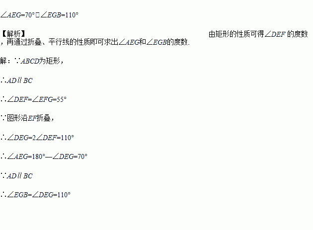 如图,把一张长方形ABCD的纸片沿EF折叠后,ED与BC的交点为G,点D、C分别落在D′、C′的位置上,若∠EFG=55°,求∠AEG和∠EGB的度数.