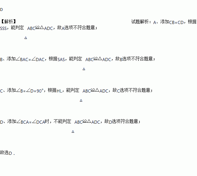 A. CB=CD B. ∠BAC=∠DAC C. ∠B=∠D=90° D. ∠BCA=∠DCA