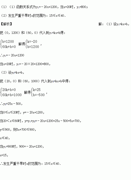(1)求原有蓄水量y1(万m3)与时间x(天)的函数关系式,并求当x=20时的水库总蓄水量.