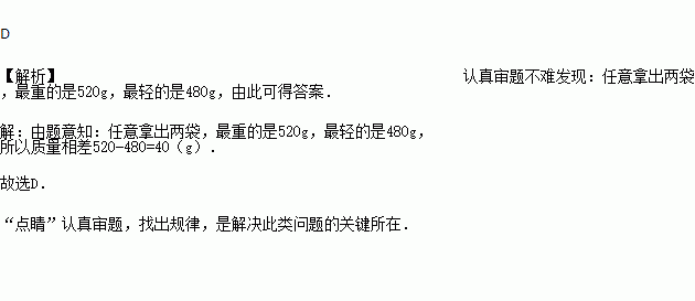 时代超市出售的三种品牌月饼袋上,分别标有质量为:(500±5)g、(500±10)g、(500±20)g的字样,从中任意拿出两袋,它们的质量最多相差( )