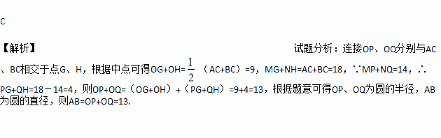 如图,C是以AB为直径的半圆O上一点,连结AC,BC,分别以AC,BC为边向外作正方形ACDE与BCFG,点M,N,P,Q分别是DE,FG,弧AC,弧BC的中点.若MP+NQ=14,AC+BC=18,则AB的长是( )