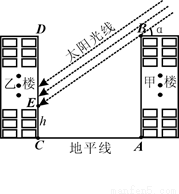 (2) 当α=30°时,甲楼楼顶B点的影子落在乙楼的第几层?若α每小时增加15°,从此时起几小时后甲楼的影子刚好不影响乙楼采光 ?