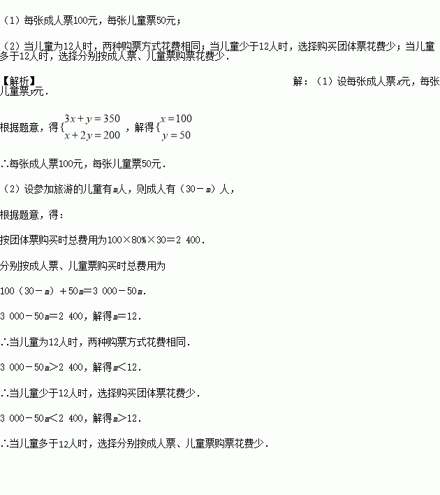 (2)若干家庭结伴到该景区旅游,成人和儿童共30人.售票处规定:一次性购票数量达到30张,可购买团体票,每张票均按成人票价的八折出售,请你帮助他们选择花费最少的购票方式.