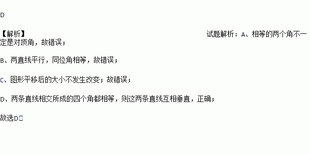 D. 两条直线相交所成的四个角都相等,则这两条直线互相垂直