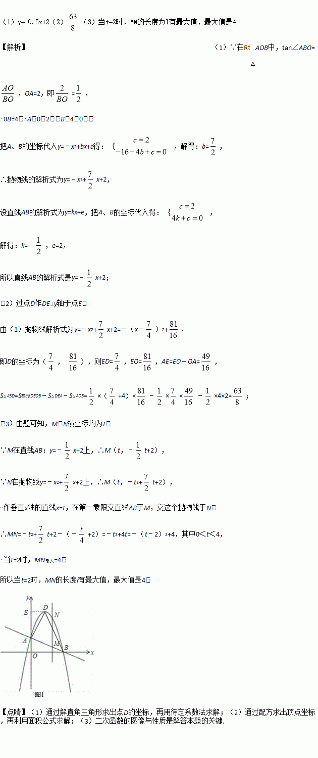 如图,直线AB分别交y轴、x轴于A、B两点,OA=2,tan∠ABO=0.5,抛物线y=﹣x2+bx+c过A、B两点.