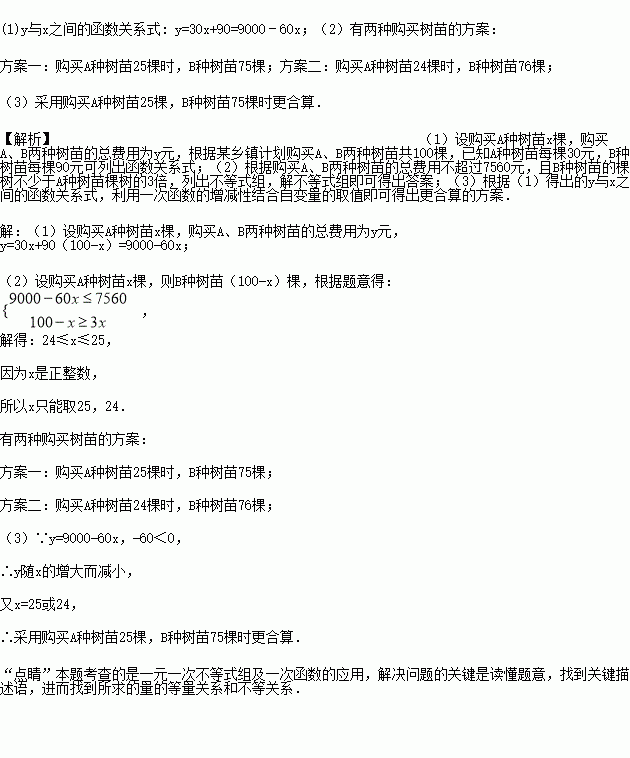 某乡镇计划购买A、B两种树苗共100棵,已知A种树苗每棵30元,B种树苗每棵90元.