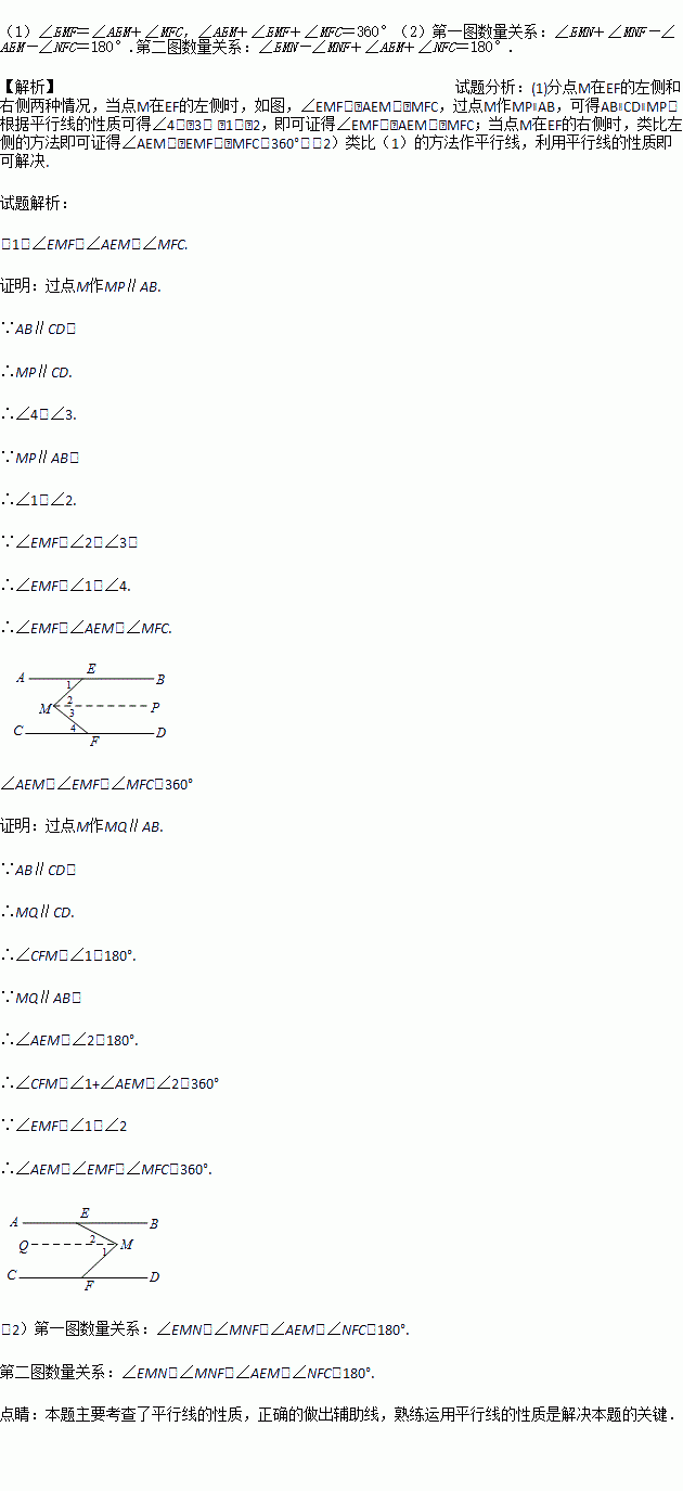 (1) 在AB,CD之间有一点M(点M不在线段EF上),连接ME,MF,试探究∠AEM,∠EMF,∠MFC之间有怎样的数量关系. 请补全图形,并在图形下面写出相应的数量关系,选其中一个进行证明.
