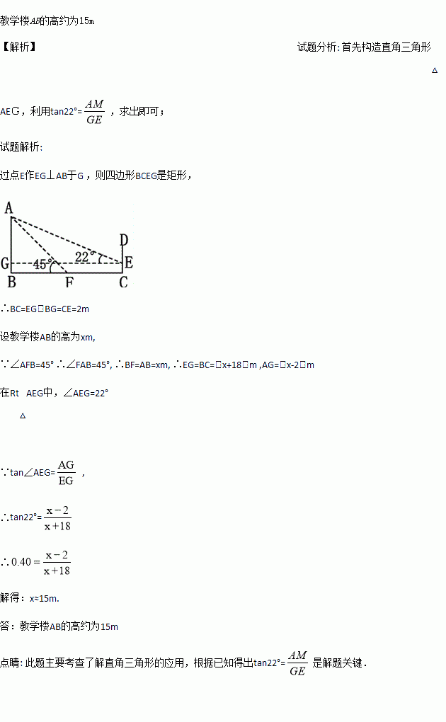 如图,某教学楼AB的后面有一建筑物CD,当光线与地面的夹角是22°时,教学楼在建筑物的墙上留下高2m的影子CE;而当光线与地面夹角是45°时,教学楼顶部A在地面上的影子F与墙角C的距离为18m(B、F、C在同一直线上). 求教学楼AB的高;(结果保留整数)(参考数据:sim22°≈0.37,cos22°≈0.93, tan22°≈0.40)