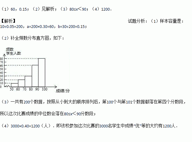 (4)若成绩在90分以上(包括90分)的为“优”等,则该校参加这次比赛的3000名学生中成绩“优”等约有多少人?