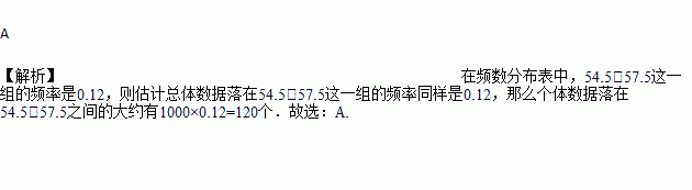 在1000个数据中,用适当的方法抽取50个作为样本进行统计,频数分布表中54.5~57.5这一组的频率是0.12,那么个体数据落在54.5~57.5之间的约有( ).