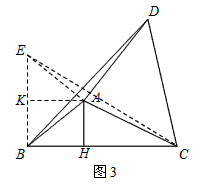 | £¨3£©¡ÏDAC=2¡ÏABC³ÉÁ¢£¬ÒÔÏÂÖ¤Ã÷£º Èçͼ3£¬¹ýµãB×÷BE¡ÎAH£¬²¢ÔÚBEÉÏÈ¡BE=2AH£¬Á¬½ÓEA£¬EC£¬ ²¢È¡BEµÄÖеãK£¬Á¬½ÓAK£¬ ¡ßAH¡ÍBCÓÚH£¬¡¢ ¡à¡ÏAHC=90¡ã£¬ ¡ßBE¡ÎAH£¬ ¡à¡ÏEBC=90¡ã£¬ ¡ß¡ÏEBC=90¡ã£¬BE=2AH£¬ ¡àEC2=EB2+BC2=4AH2+BC2£¬ ¡ßBD2=4AH2+BC2£¬ ¡àEC=BD£¬ ¡ßKΪBEµÄÖе㣬BE=2AH£¬ ¡àBK=AH£¬ ¡ßBK¡ÎAH£¬ ¡àËıßÐÎAKBHΪƽÐÐËıßÐΣ¬ ÓÖ¡ß¡ÏEBC=90¡ã£¬ ¡àËıßÐÎAKBHΪ¾ØÐΣ¬ ¡à¡ÏAKB=90¡ã£¬ ¡àAKÊÇBEµÄ´¹Ö±Æ½·ÖÏߣ¬ ¡àAB=AE£¬ ¡ßAB=AE£¬EC=BD£¬AC=AD£¬ ¡à¡÷EAC¡Õ¡÷BAD£¬ ¡à¡ÏEAC=¡ÏBAD£¬ ¡à¡ÏEAC-¡ÏEAD=¡ÏBAD-¡ÏEAD£¬ ¼´¡ÏEAB=¡ÏDAC£¬ ¡ß¡ÏEBC=90¡ã£¬¡ÏABCΪÈñ½Ç£¬ ¡à¡ÏABC=90¡ã-¡ÏEBA£¬ ¡ßAB=AE£¬ ¡à¡ÏEBA=¡ÏBEA£¬ ¡à¡ÏEAB=180¡ã-2¡ÏEBA£¬ ¡à¡ÏEAB=2¡ÏABC£¬ ¡à¡ÏDAC=2¡ÏABC¡£ |