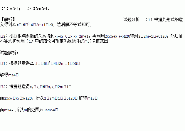 (2)如果方程的两个实数根为x1,x2,且2x1x2+x1+x2≥20,求m的取值范围.